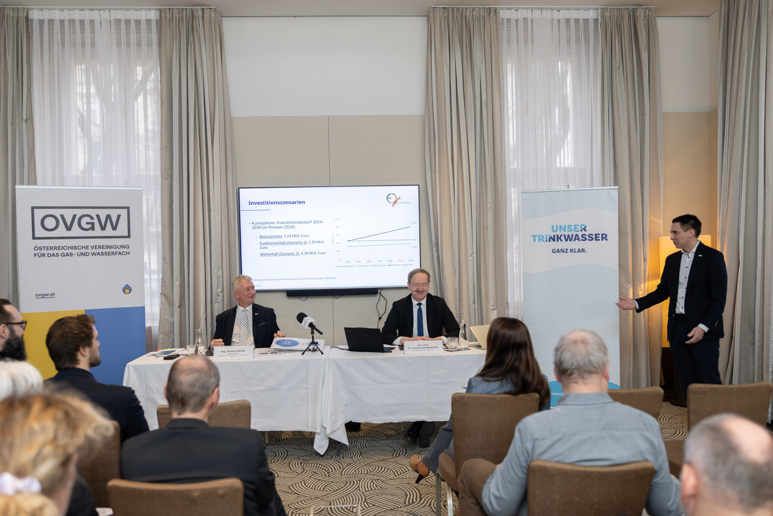 Für den Werterhalt und die langfristige Absicherung der Infrastruktur der österreichischen Trinkwasserversorgung sind bis zum Jahr 2030 Investitionen in Höhe von etwa 4,3 Milliarden Euro erforderlich. Diese Investitionen würden langfristig zu einer Bruttowertschöpfung von knapp 3 Milliarden Euro führen und rund 30.000 Jahresbeschäftigungsverhältnisse sichern oder schaffen. Würde der Bund stärker in den Werterhalt der Trinkwasserversorgungsanlagen investieren, könnten nahezu doppelt so viele Arbeitsplätze gesichert werden, wie es bei Maßnahmen der Fall wäre, die lediglich den Betrieb der Anlagen aufrechterhalten.