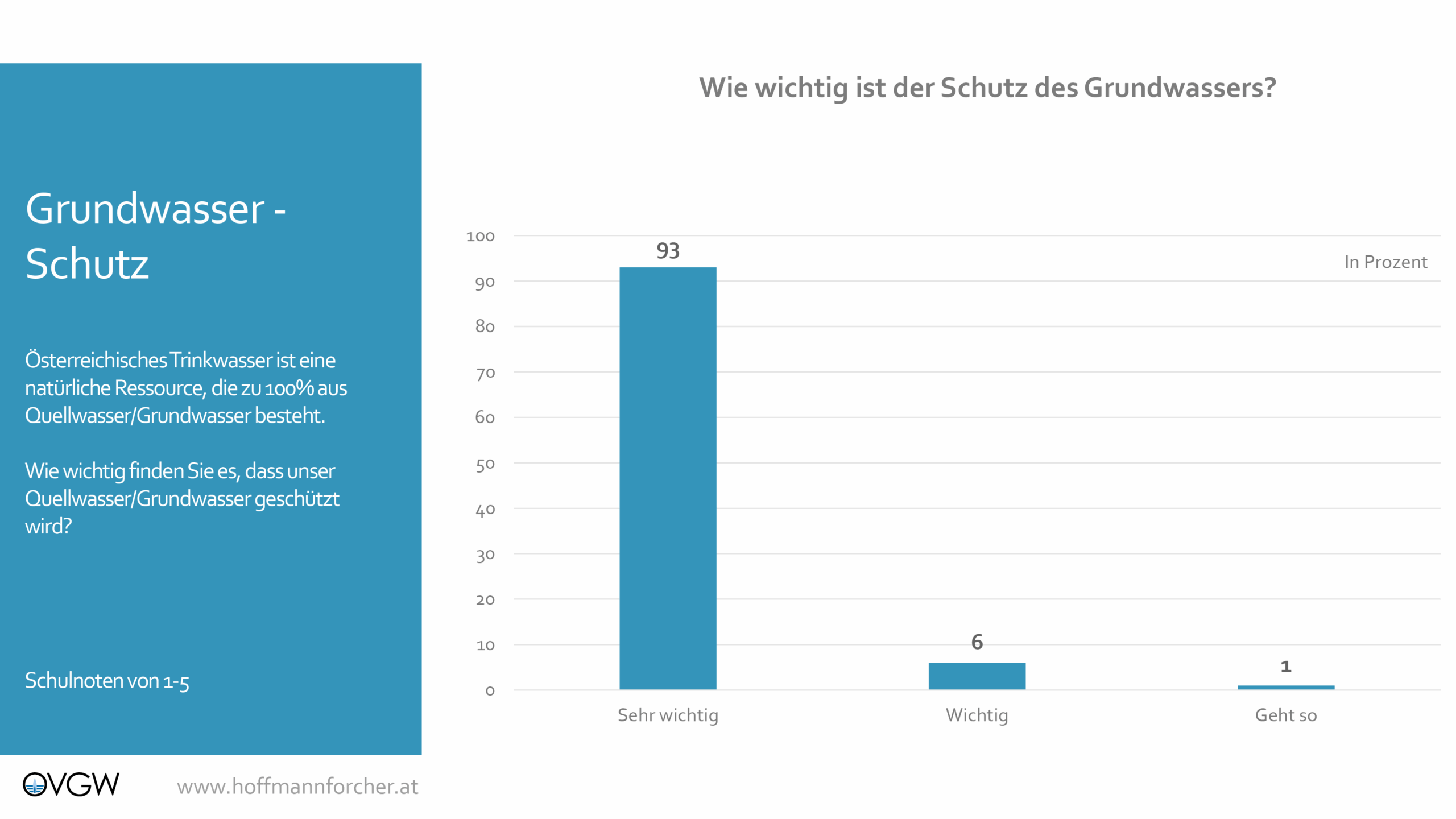 93 % der Befragten betonen die große Bedeutung des Grundwasserschutzes. Österreichs Trinkwasser stammt zu 100 % aus Quellen und Brunnen, dem gut geschützten Grundwasser. Heiße Sommer, die Trockenperioden der letzten Jahre und die verstärkte Beschäftigung der Bevölkerung mit dem Klimawandel hinterlassen ihre Spuren: Das Bewusstsein in der Bevölkerung für den Umgang mit Wasser verändert sich. „Die hohe Wertigkeit des Wassers und die damit verbundene Erhaltung des derzeitigen Qualitätsstandards ist damit auch ein wichtiger Auftrag von der Bevölkerung, den wir zu erfüllen haben. Wir müssen alles tun, um dieses wichtige Gut auch für die zukünftigen Generationen zu schützen und zu wahren“, sagt ÖVGW-Vizepräsident Mag. Nikolaus Sauer, Sprecher des Wasserfachs.
