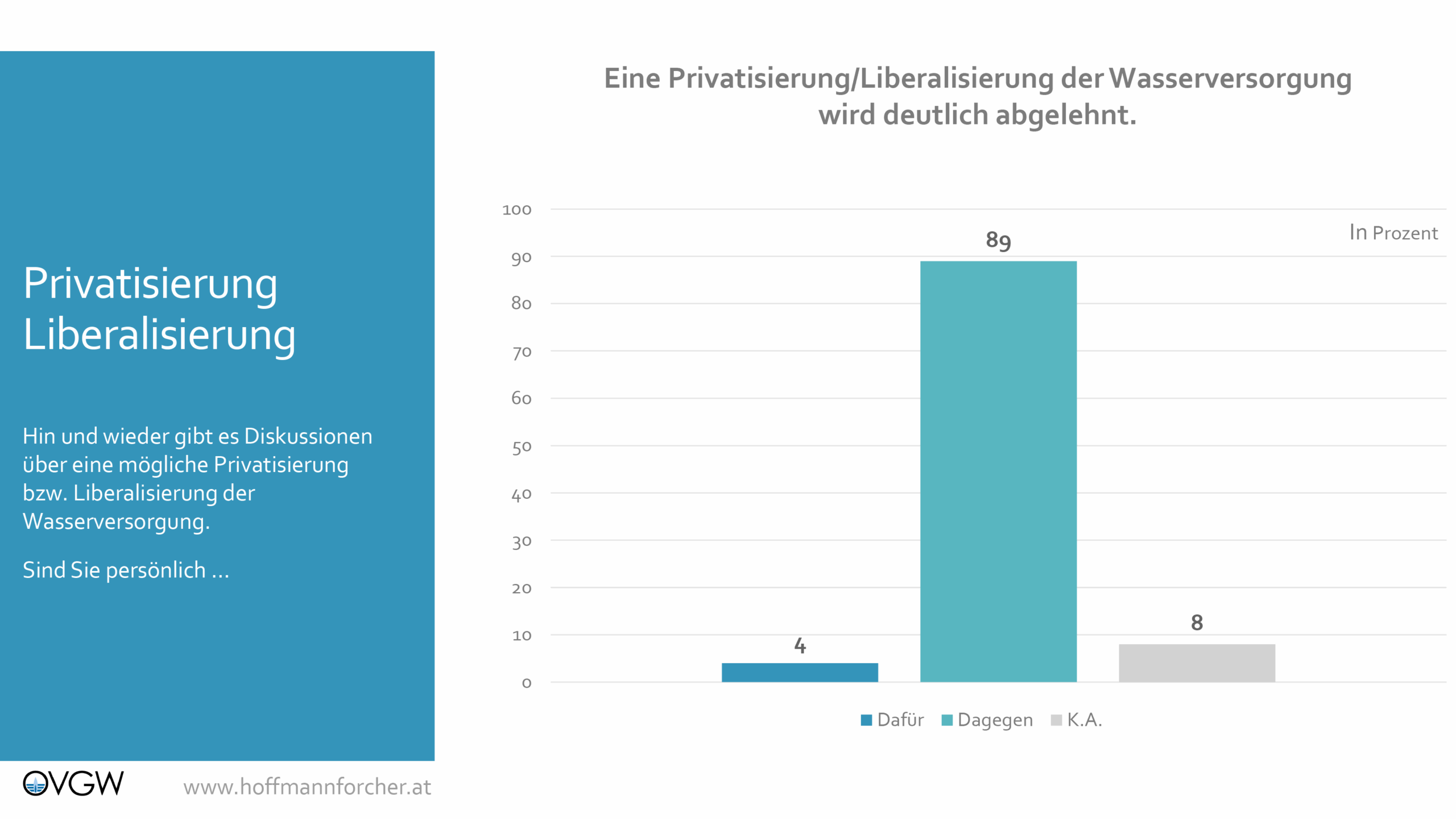 89 % sprechen sich klar gegen eine Privatisierung der Trinkwasserversorgung aus – trotz wiederkehrender Diskussionen über mögliche Liberalisierungen. „Zu Liberalisierungstendenzen bzw. den möglichen Privatisierungen im Bereich der Wasserversorgung gibt es ein hier ein klares Ergebnis. 89 % der Befragten stehen hinter dem Modell der öffentlichen, gemeinnützigen und regionalen Wasserversorgung. In einem gemeinnützigen System werden keine Profite erwirtschaftet. Die Einnahmen werden wieder in die Erhaltung und den Ausbau der Infrastruktur investiert“, so ÖVGW-Vizepräsident Nikolaus Sauer.